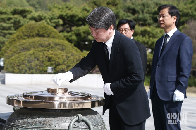 15일 오전 서울 동작구 국립현충원에서 국민의당 안철수, 천정배 공동대표를 비롯한 당 지도부와 제20대 국회의원선거에서 당선된 국민의당 당선인들이 참배를 하고 있다.