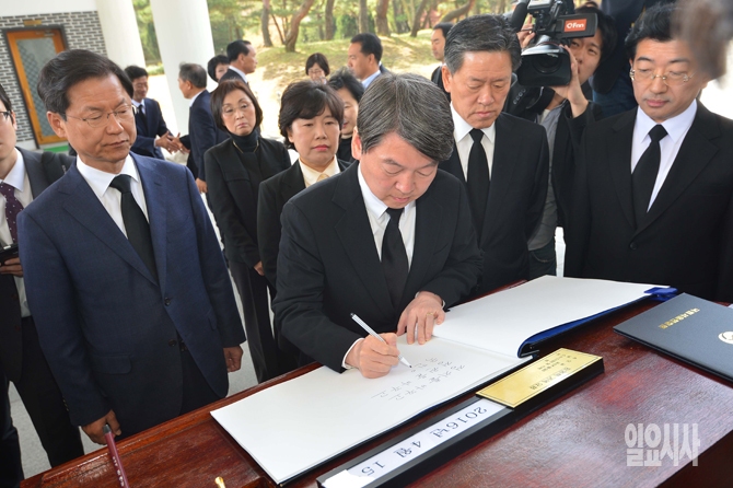 15일 오전 서울 동작구 국립현충원에서 국민의당 안철수 공동대표가 현충탑 앞에서 참배를 가진 후 방명록을 작성하고 있다.