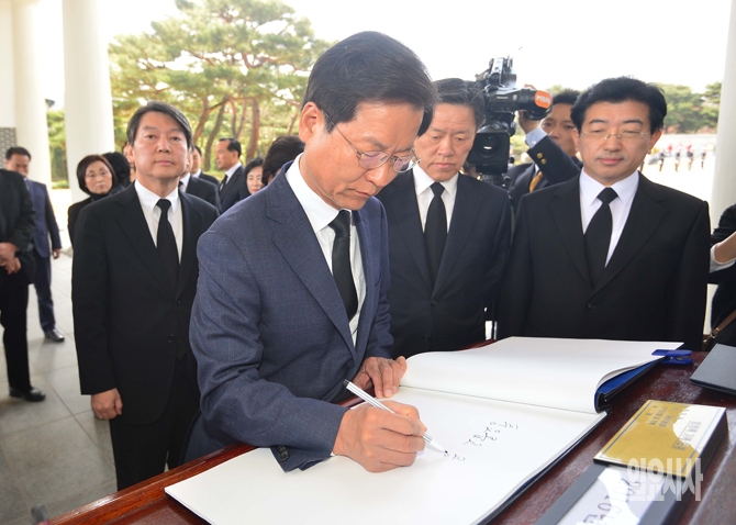 15일 오전 서울 동작구 국립현충원에서 국민의당 천정배 공동대표가 현충탑 앞에서 참배를 가진 후 방명록을 작성하고 있다.