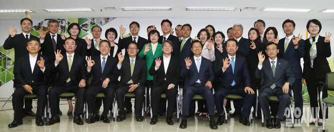 15일 오전 서울 마포구 국민의당 당사에서 열린 당선자 대회 및 선대위 해단식에서 국민의당 안철수, 천정배 공동대표를 비롯한 당 지도부와 제20대 국회의원선거에 출마한 당선자 및 낙선자들이 포토타임을 갖고 있다.