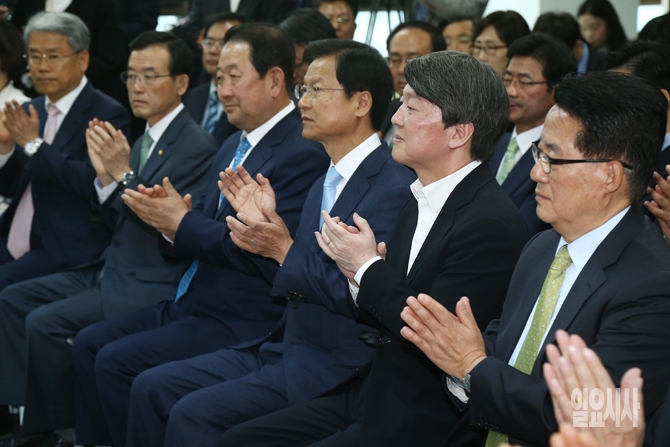 15일 오전 서울 마포구 국민의당 당사에서 열린 당선자 대회 및 선대위 해단식에서 국민의당 안철수, 천정배 공동대표를 비롯한 당 지도부가 박수를 치고 있다.