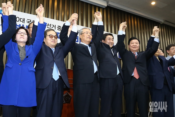 15일 오후 서울 여의도 국회에서 열린 더불어민주당 중앙선거대책위원회 해단식에서 김종인 더불어민주당 비대위 대표가 제20대 국회의원선거 지역구 및 비례당선인들과 포토타임을 갖고 있다.