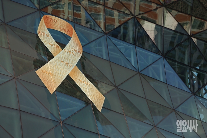 세월호 2주기가 하루 앞둔 15일 오후 서울시청 외벽에 세월호 실종자들과 희생자들을 기리기 위한 노란색 리본이 부착되어 있다.