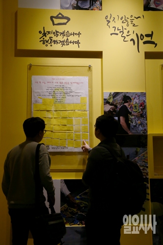 세월호 2주기가 하루 앞둔 15일 오후 서울 중구 서울도서관에 마련된 세월호 기억공간을 시민들이 둘러보고 있다.
