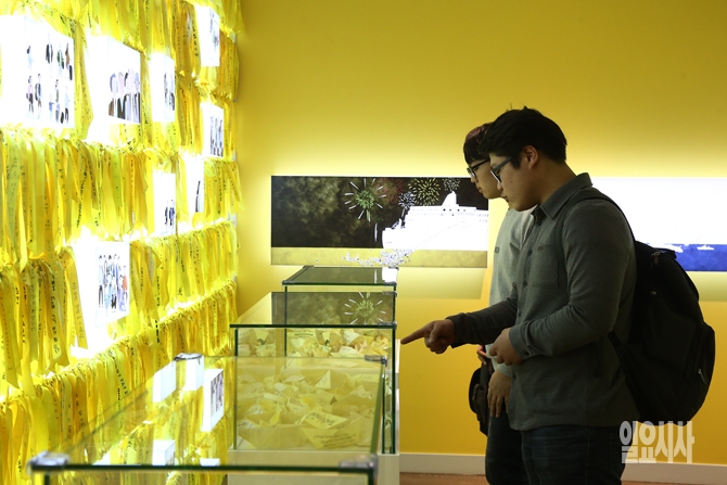 세월호 2주기가 하루 앞둔 15일 오후 서울 중구 서울도서관에 마련된 세월호 기억공간을 시민들이 둘러보고 있다.