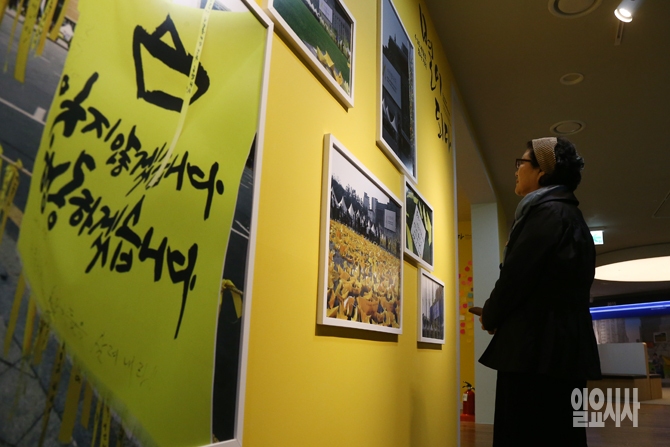 세월호 2주기가 하루 앞둔 15일 오후 서울 중구 서울도서관에 마련된 세월호 기억공간을 한 시민이 둘러보고 있다.