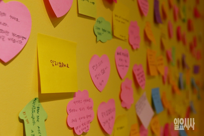 세월호 2주기가 하루 앞둔 15일 오후 서울 중구 서울도서관에 마련된 세월호 기억공간에 시민들이 희생자와 실종자들에게 보내는 메시지가 부착되어 있다.