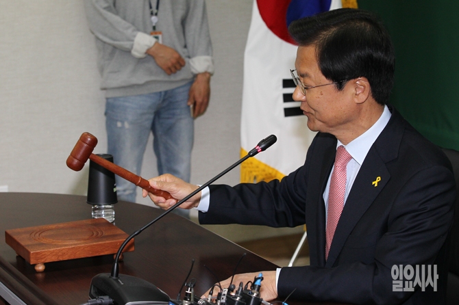 18일 오전 서울 마포구 국민의당 당사에서 열린 국민의당 최고위 회의에서 천정배 국민의당 공동대표가 의사봉을 두드리고 있다.