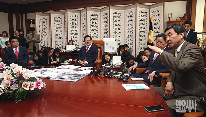 18일, 서울 여의도 국회 의장 접견실에서 정의화 국회의장(사진 왼쪽서 두 번째)과 원유철 새누리당 비대위원장, 이종걸 더불어민주당(오른쪽)·주승용 국민의당 원내대표가 회동을 갖고 있는 가운데, 이 원내대표가 발언을 하고 있다.