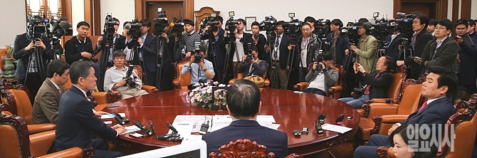 18일, 서울 여의도 국회 의장 접견실에서 정의화 국회의장, 원유철 새누리당 비대위원장, 이종걸 더불어민주당·주승용 국민의당 원내대표가 첫 3자 회동을 갖고 있는 가운데 구름 같은 취재진이 몰려 취재경쟁을 벌이고 있다.