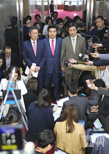 18일, 서울 여의도 국회 의장 접견실에서 정의화 국회의장 및 원유철 새누리당 비대위원장, 이종걸 더불어민주당·주승용 국민의당 원내대표가 첫 3자 회동 직후 취재진에 둘러싸여 있다.