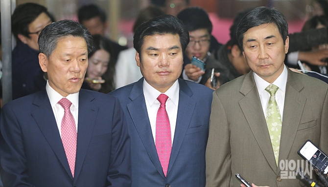 18일, 서울 여의도 국회 의장 접견실에서 정의화 국회의장 및 원유철 새누리당 비대위원장(사진 가운데), 이종걸 더불어민주당(오른쪽)·주승용 국민의당 원내대표가 첫 3자 회동 직후, 취재진의 질문에 답변하고 있다.