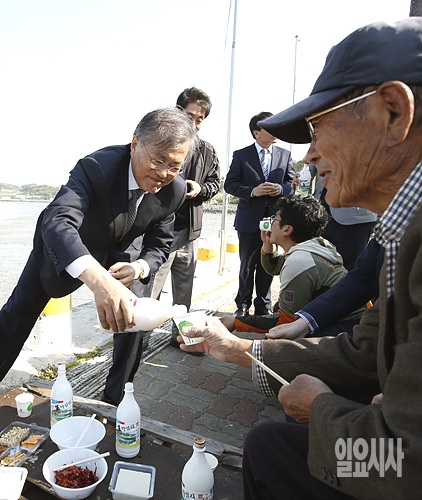 18일, 문재인 더불어민주당 전 대표가 전남 신안군 하의도를 찾아 한 주민에게 막걸리를 따르고 있다. (사진=문재인 의원실)