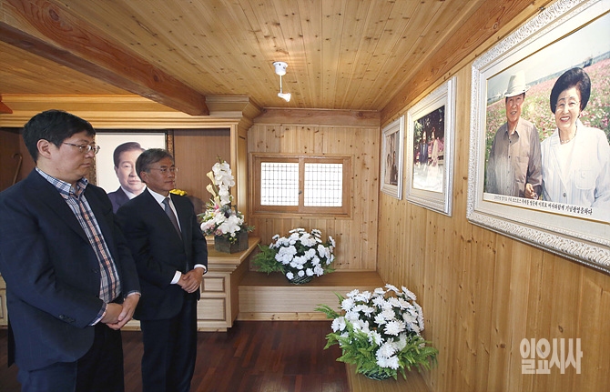 18일, 문재인 더불어민주당 전 대표가 전남 신안군 하의도 DJ(김대중 전 대통령) 생가를 찾아 삼남 홍걸씨와 함께 생전 사진을 물끄러미 바라보고 있다. (사진=문재인 의원실)