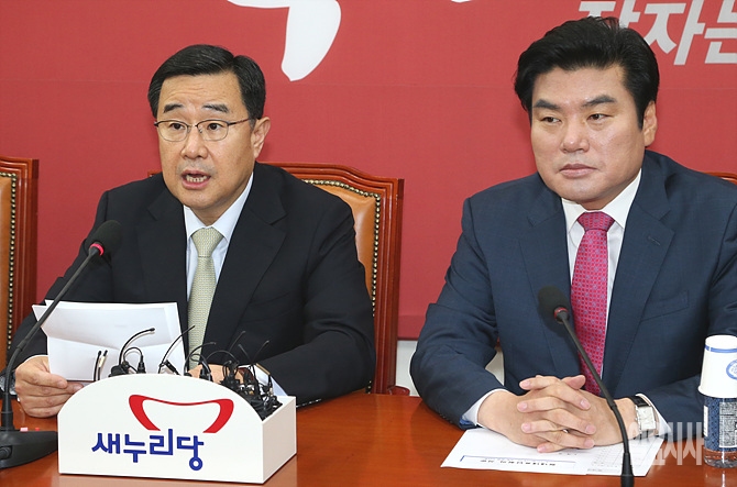 19일, 서울 여의도 국회서 열린 새누리당 원내대표단 회의 도중 김정훈 정책위의장이 발언을 하고 있다.