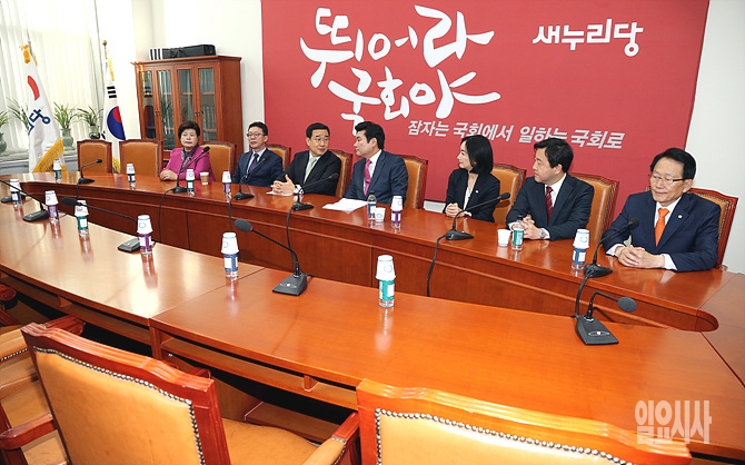 19일, 서울 여의도 국회서 새누리당 원내대표단 회의에 앞서 잠시 지도부 인사들이 이야기를 나누고 있다.