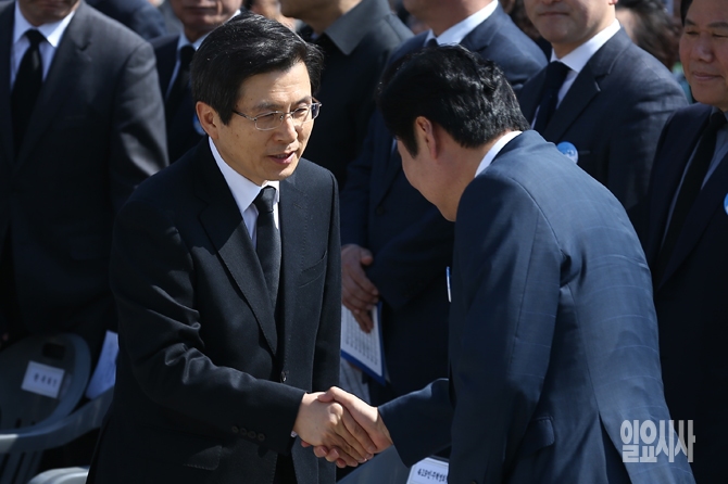 4.19혁명 56주기인 19일 오전 서울 강북구 국립4.19민주묘지에서 열린 제56주년 4.19혁명 기념식에서 황교안 국무총리와 원유철 새누리당 원내대표가 악수를 하고 있다.