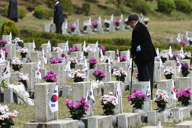 4.19혁명 56주기인 19일 오전 서울 강북구 국립4.19민주묘지에서 열린 제56주년 4.19혁명 기념식 후 한 유족이 묘비를 바라보고 있다.