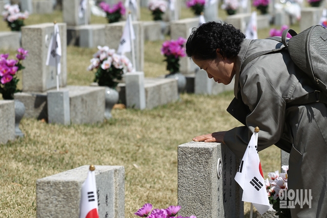 4.19혁명 56주기인 19일 오전 서울 강북구 국립4.19민주묘지에서 열린 제56주년 4.19혁명 기념식 후 한 유족이 묘비를 어루만지고 있다.