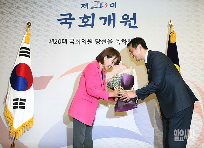 19일, 서울 여의도 국회서 더불어민주당 전현희 의원이 20대 국회 개원종합실 등록을 마친 후 사무처 직원으로부터 꽃다발을 받아 들고 있다.