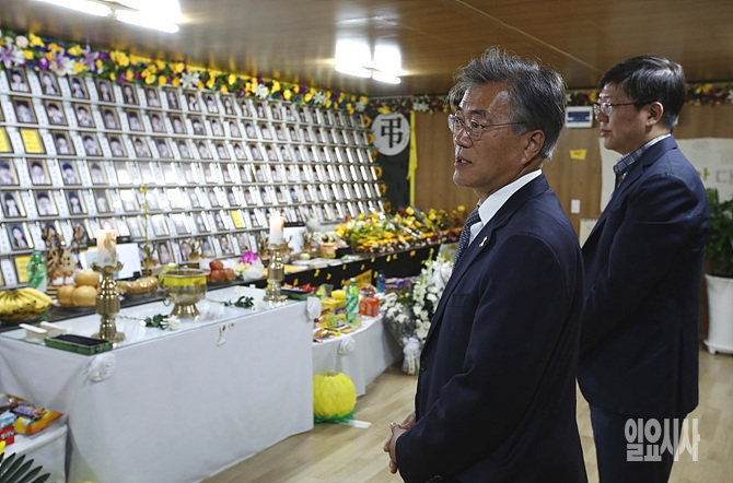 지난 18일, 문재인 더불어민주당 전 대표와 DJ(김대중 전 대통령) 삼남 홍걸씨가 전남 진도 팽목항 세월호 합동분향소를 찾아 유가족들을 위로하고 있다. (사진=문재인 의원실)