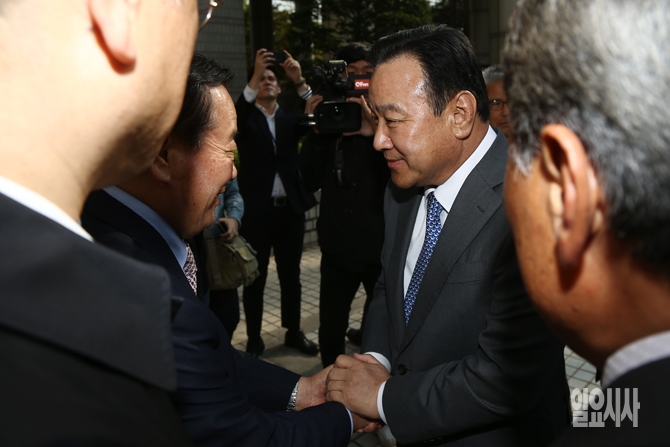 19일 오후 서울 서초동 서울고등법원에서 고 성완종 전 경남기업 회장에게 불법정치자금을 수수한 혐의로 1심에서 집행유예를 선고 받은 이완구 전 국무총리가 항소심 공판에 출석 전 지지자들과 악수를 하고 있다.