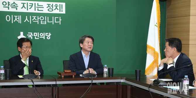 20일 오전 서울 마포구 국민의당 당사에서 열린 국민의당 최고위 회의에서 국민의당 안철수, 천정배 공동대표와 주승용 원내대표가 대화를 하고 있다.