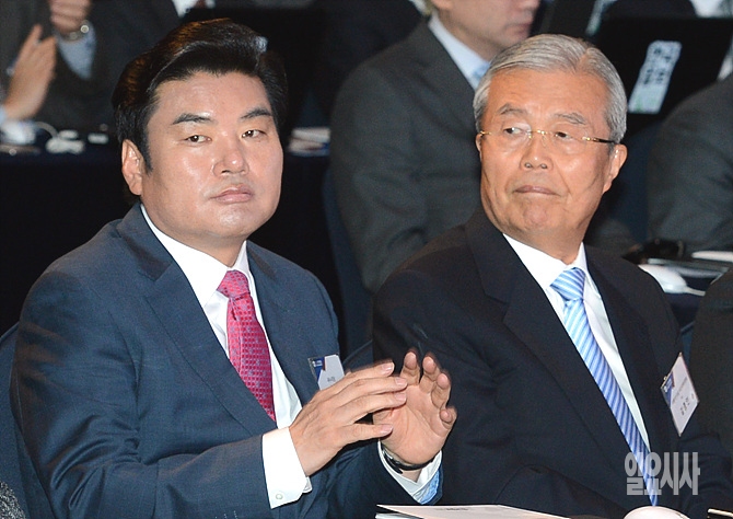 20일, 서울 중구 소공동 롯데호텔 크리스탈볼룸서 열린 '2016한국포럼'에 김종인 더불어민주당 대표(사진 오른쪽)과 원유철 새누리당 원내대표가 참석해 있다. (사진공동취재단)