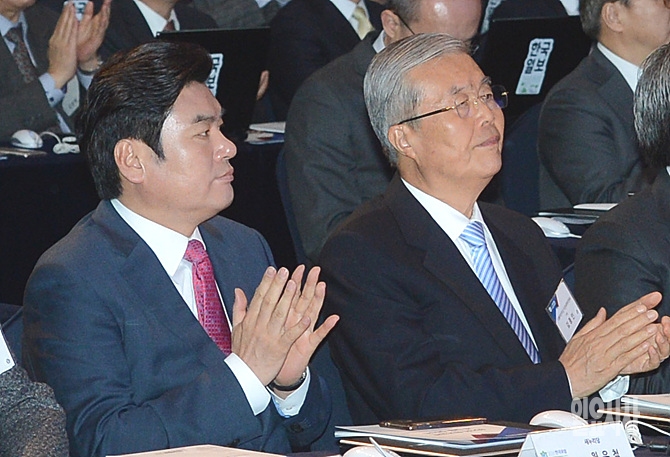 20일, 서울 중구 소공동 롯데호텔 크리스탈볼룸서 열린 '2016한국포럼'에 김종인 더불어민주당 대표(사진 오른쪽)과 원유철 새누리당 원내대표가 참석해 손뼉을 치고 있다. (사진공동취재단)