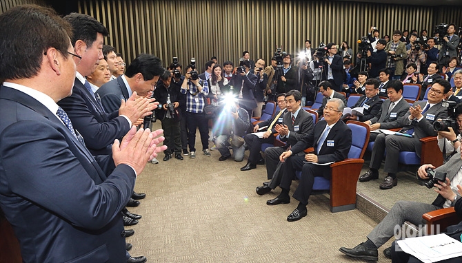 20일, 서울 여의도 국회서 열린 더불어민주당 제20대 국회 당선자대회에서 국회에 입성한 의원들이 자축의 박수와 함께 축하를 받고 있다.