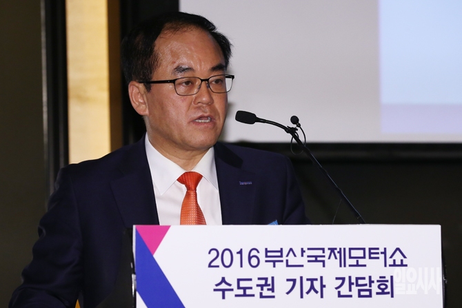 21일 오전 서울 여의도 콘래드호텔에서 열린 2016 부산국제모터쇼 수도권 기자간담회에서 함정오 벡스코 대표이사가 인사말을 하고 있다.