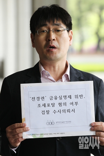 전국경제인연합회(전경련)가 보수성향 시민단체 대한민국어버이연합의 차명계좌로 자금을 지원했다는 의혹이 불거진 가운데 21일 오후 서울 서초구 서울중앙지검에서 경제정의실천시민연합(경실련) 관계자가 전경련의 금융실명제 위반, 조세포탈, 업무상 배임 혐의 여부에 대해 검찰 수사의뢰서를 제출하기 전 발언을 하고 있다.