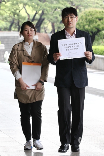 전국경제인연합회(전경련)가 보수성향 시민단체 대한민국어버이연합의 차명계좌로 자금을 지원했다는 의혹이 불거진 가운데 21일 오후 서울 서초구 서울중앙지검에서 경제정의실천시민연합(경실련) 관계자들이 전경련의 금융실명제 위반, 조세포탈, 업무상 배임 혐의 여부에 대해 검찰 수사의뢰서를 제출하기 위해 검찰청사로 향하고 있다.