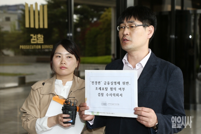 전국경제인연합회(전경련)가 보수성향 시민단체 대한민국어버이연합의 차명계좌로 자금을 지원했다는 의혹이 불거진 가운데 21일 오후 서울 서초구 서울중앙지검에서 경제정의실천시민연합(경실련) 관계자가 전경련의 금융실명제 위반, 조세포탈, 업무상 배임 혐의 여부에 대해 검찰 수사의뢰서를 제출하기 전 발언을 하고 있다.