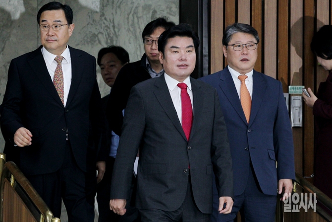 22일 오전 서울 여의도 국회에서 열린 새누리당 원내대책회의에 새누리당 원유철 원내대표와 조원진 원내수석부대표, 김정훈 정책위의장이 입장하고 있다.