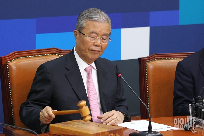 22일 오전 서울 여의도 국회에서 열린 더불어민주당 비상대책위원회의에서 김종인 더불어민주당 비대위 대표가 의사봉을 두드리고 있다.