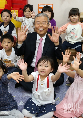 김종인 더불어민주당 비대위 대표가 22일 오전 서울 여의도 국회 제3어린이집을 찾아 어린이들과 기념촬영을 하고 있다.