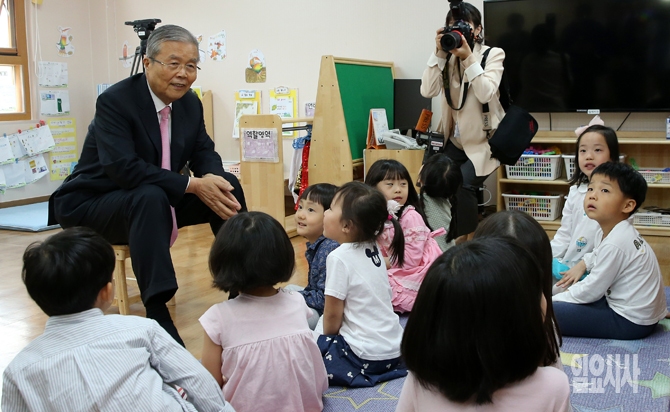 김종인 더불어민주당 비대위 대표가 22일 오전 서울 여의도 국회 제3어린이집을 찾아 어린이들과 인사를 나누고 있다.