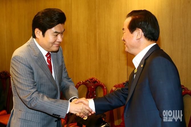 원유철 새누리당 대표권한대행 겸 원내대표가 25일 여의도 한 중식당에서 열린 '당의 화합과 발전방안에 대한 4선 이상 중진의원 오찬 간담회에서 정갑윤 의원과 인사를 나누고 있다.