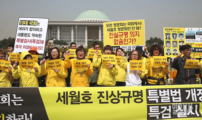 25일, 4·16 세월호 참사 진상규명 및 안전사회 건설을 위한 피해자 가족협의회 회원들이 서울 여의도 국회 앞에서 세월호 진상규명을 요구하는 특별법 개정 및 특검실시 촉구를 요구하는 기자회견을 갖고 있다.
