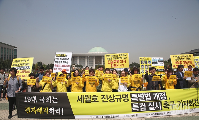 25일, 4·16 세월호 참사 진상규명 및 안전사회 건설을 위한 피해자 가족협의회 회원들이 서울 여의도 국회 앞에서 세월호 진상규명을 요구하는 특별법 개정 및 특검실시 촉구를 요구하는 기자회견을 갖고 있다.