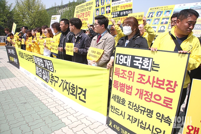25일, 4·16 세월호 참사 진상규명 및 안전사회 건설을 위한 피해자 가족협의회 회원들이 서울 여의도 국회 앞에서 세월호 진상규명을 요구하는 특별법 제정 및 특검실시 촉구를 요구하는 기자회견을 갖고 있다.