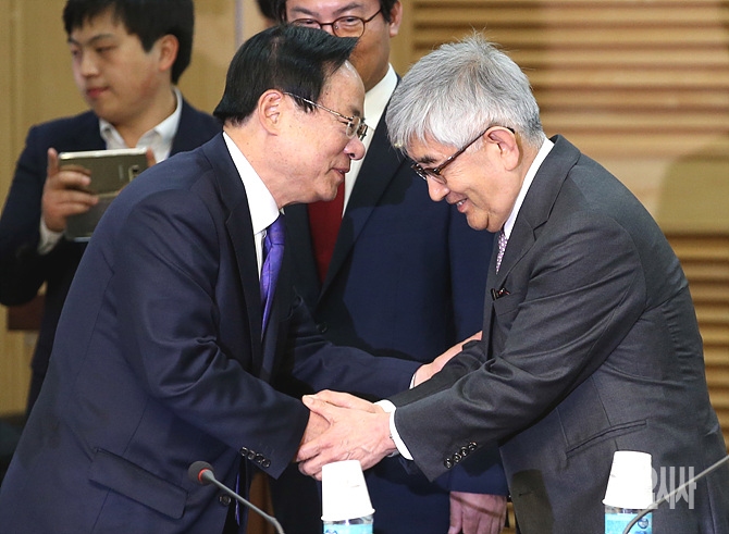 25일, 서울 여의도 국회 의원회관서 열린 새누리당 혁신모임(간사 황영철) 초대로 열린 외부인사 초청간담회 직후 이주영 의원과 최장집 고려대 명예교수가 악수를 나누고 있다.