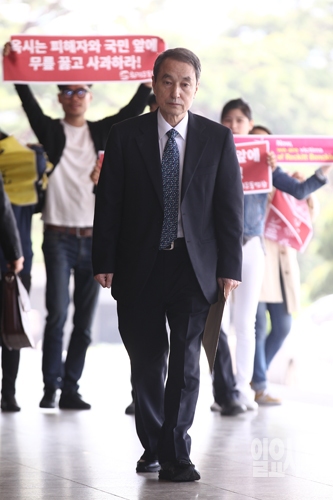 신현우 옥시 전 대표이사가 26일 오전 서울 서초구 서울중앙지검에서 피의자 신분으로 소환조사를 받기위해 입장하고 있다.