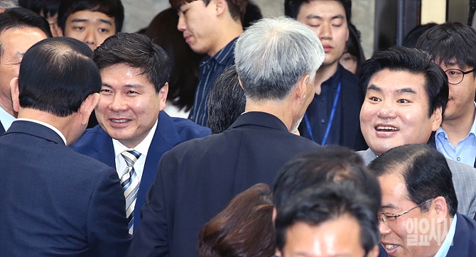 26일, 서울 여의도 국회서 열린 새누리당 당선자 워크숍에 앞서 원유철 새누리당 권한대행이 한 당선인과 악수를 나누고 있다.