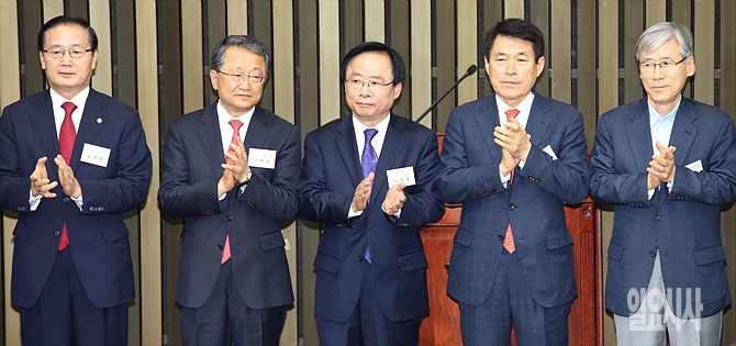 26일, 서울 여의도 국회서 새누리당 당선자 워크숍이 열린 가운데, 이주영·이군현·여상규(사진 가운데부터 오른쪽으로) 의원 등이 박수를 치고 있다.