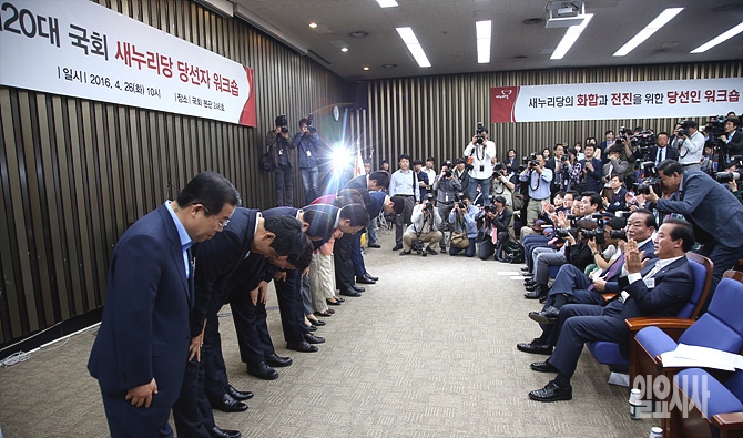 26일, 서울 여의도 국회서 열린 새누리당 당선자 워크숍 도중 20대 당선인들이 서청원 최고위원, 정갑윤 의원 등 중진들 앞에서 인사를 하고 있다.