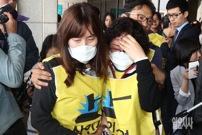 26일 오전 서울 서초구 서울중앙지검에서 신현우 옥시 전 대표이사가 피의자 신분으로 소환조사를 받기위해 출석하자 항의하던 가습기 살균제 피해자 가족들이 오열하고 있다.
