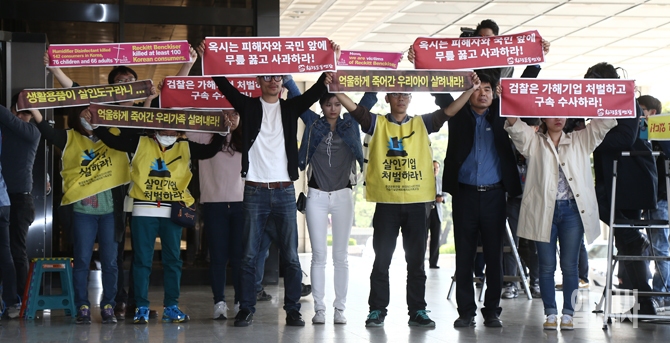 26일 오전 서울 서초구 서울중앙지검에서 신현우 옥시 전 대표이사가 피의자 신분으로 소환조사를 받기위해 출석하자 가습기 살균제 피해자 가족들이 처벌촉구을 촉구하고 있다.