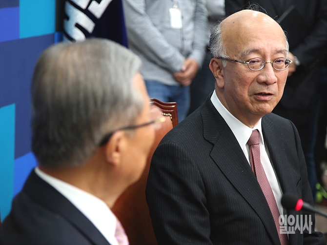 26일, 서울 여의도 국회 더불어민주당 대표실에서 벳쇼 코로(別所浩郞) 주한일본대사가 김종인 대표를 예방한 자리에서 김 대표와 환담을 나누고 있다.